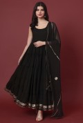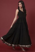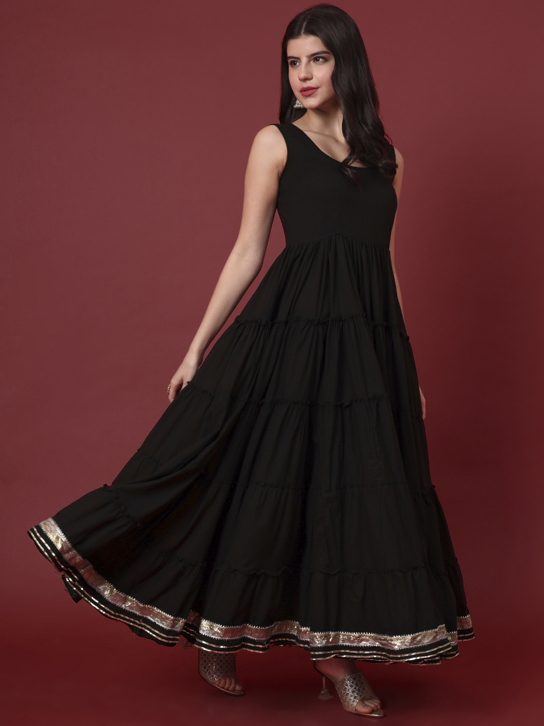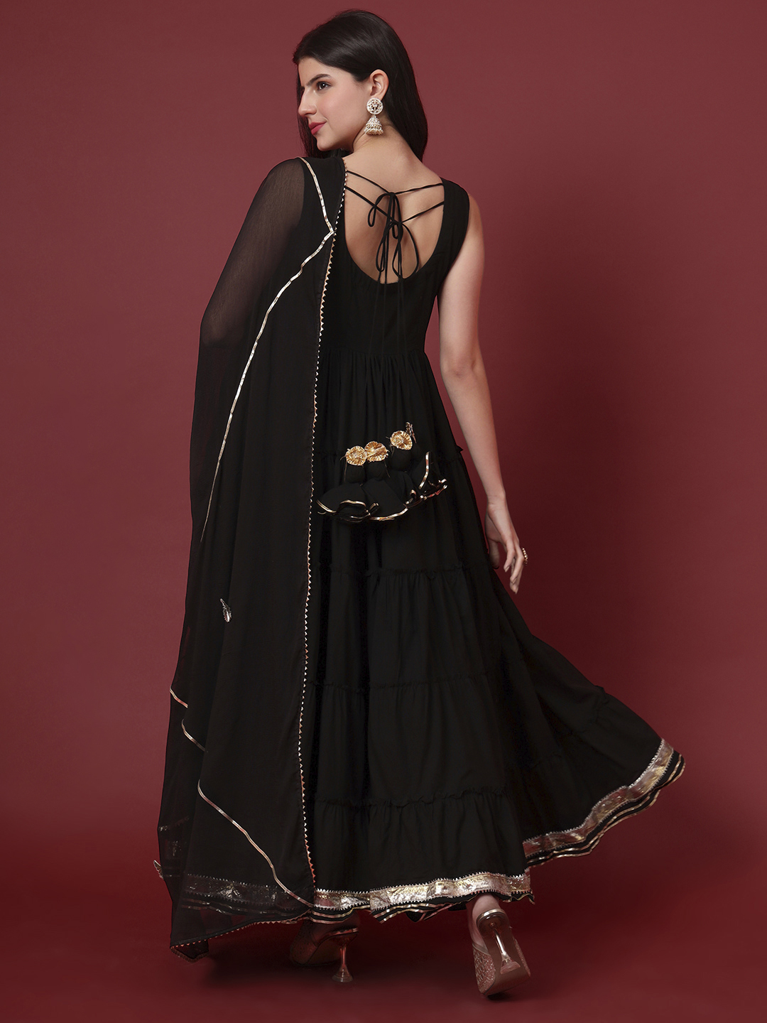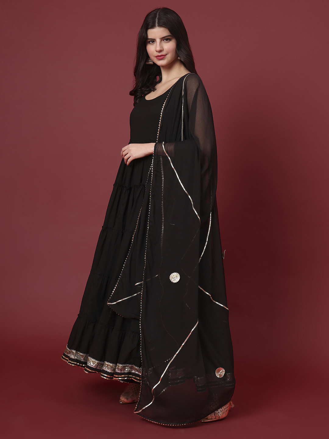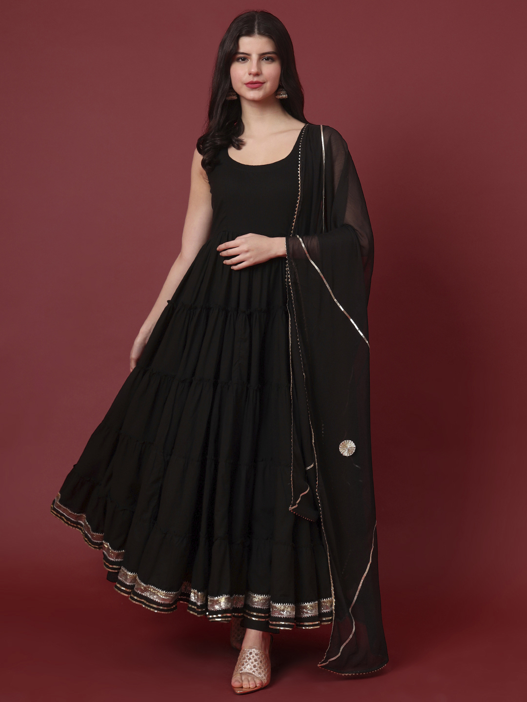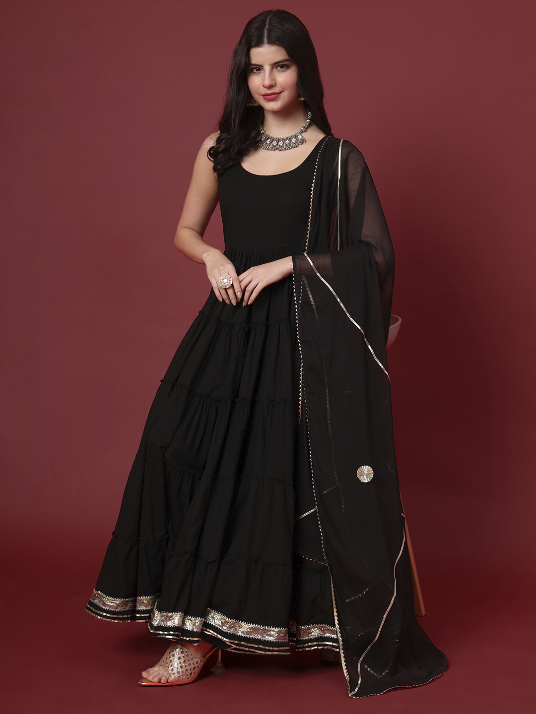 Indulge in timeless elegance with this luxurious, solid-colored, tiered Anarkali set. The full-length, voluminous silhouette is crafted from rich fabric, flowing beautifully with every step.