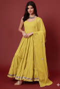 Indulge in timeless elegance with this luxurious, solid-colored, tiered Anarkali set. The full-length, voluminous silhouette is crafted from rich fabric, flowing beautifully with every step.