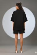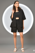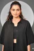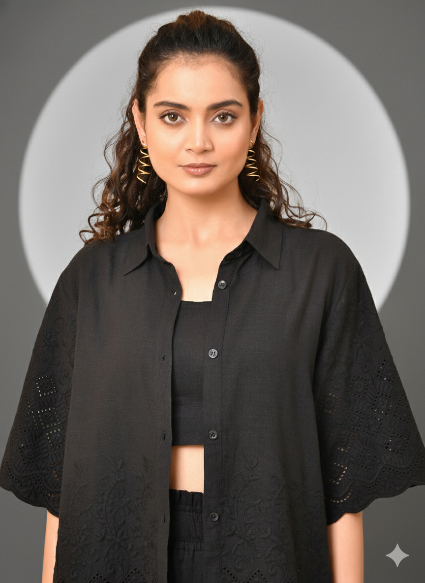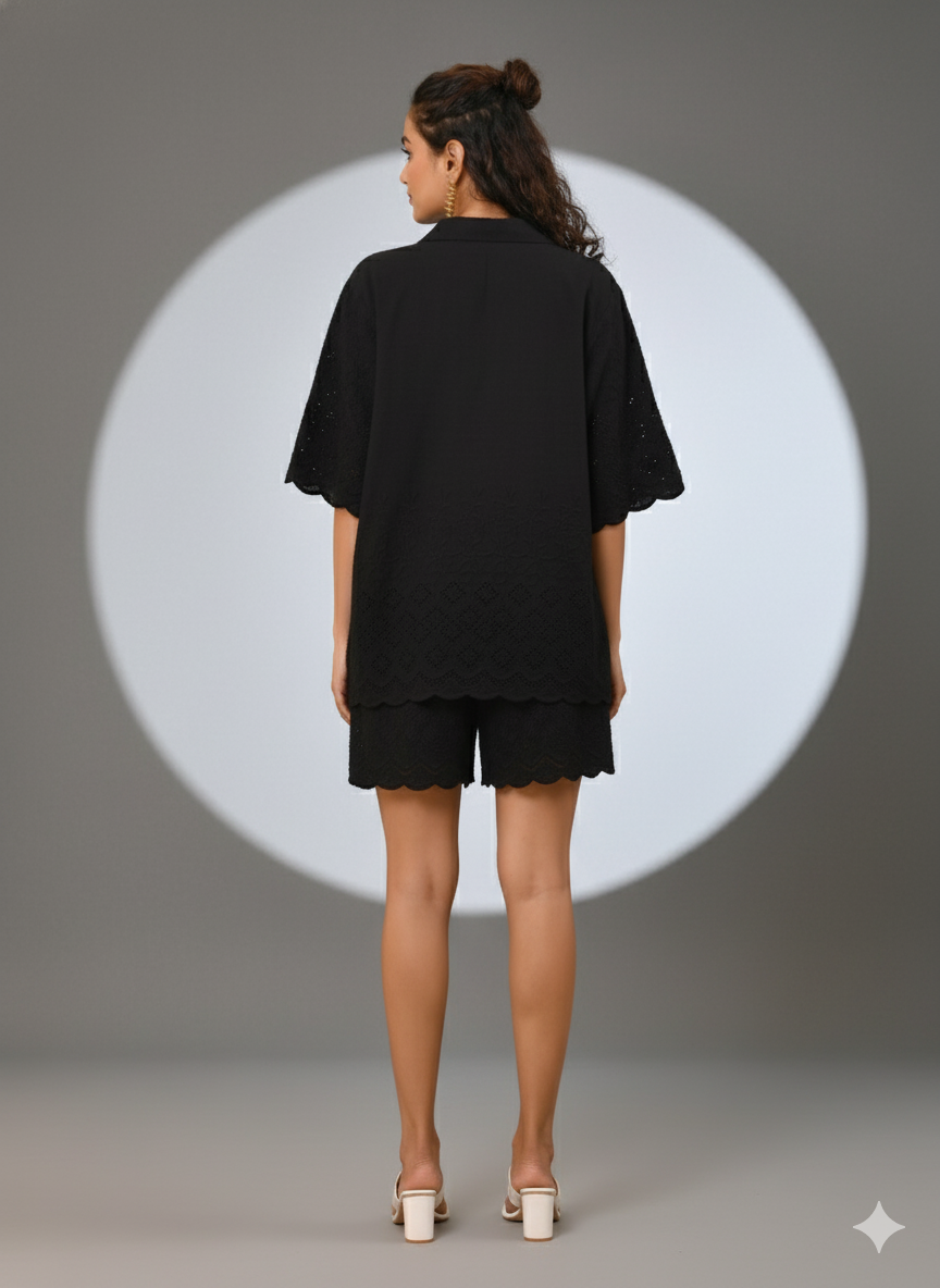 Black Schiffli Co-ord Set with Stylized Shirt and Shorts