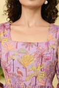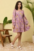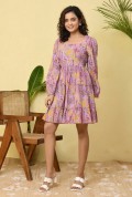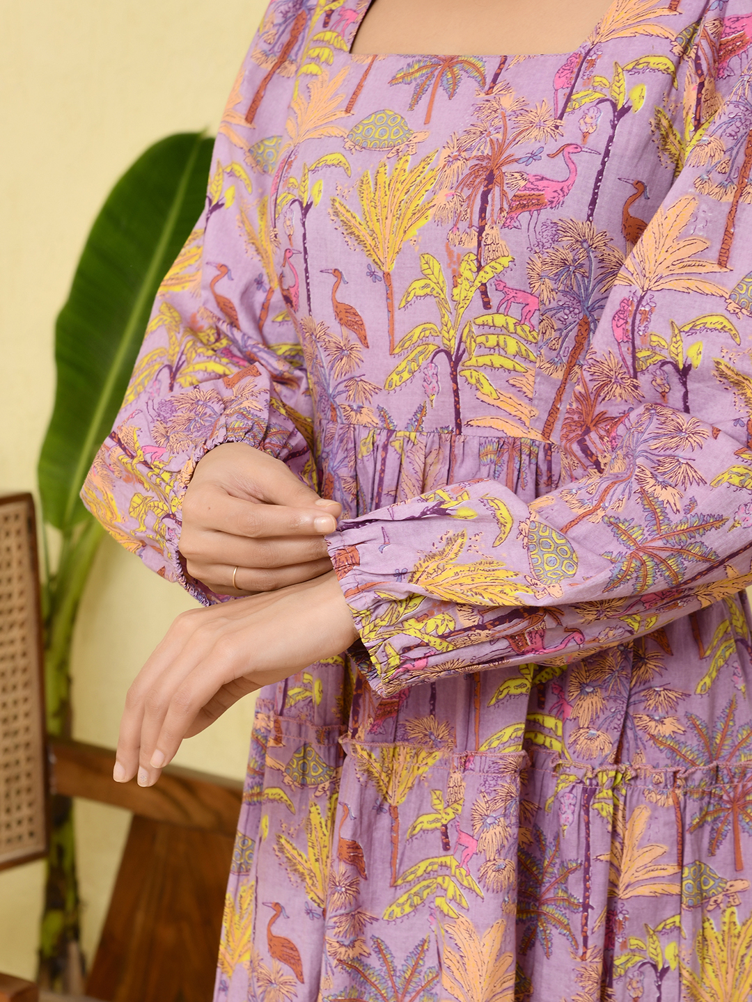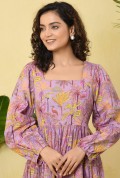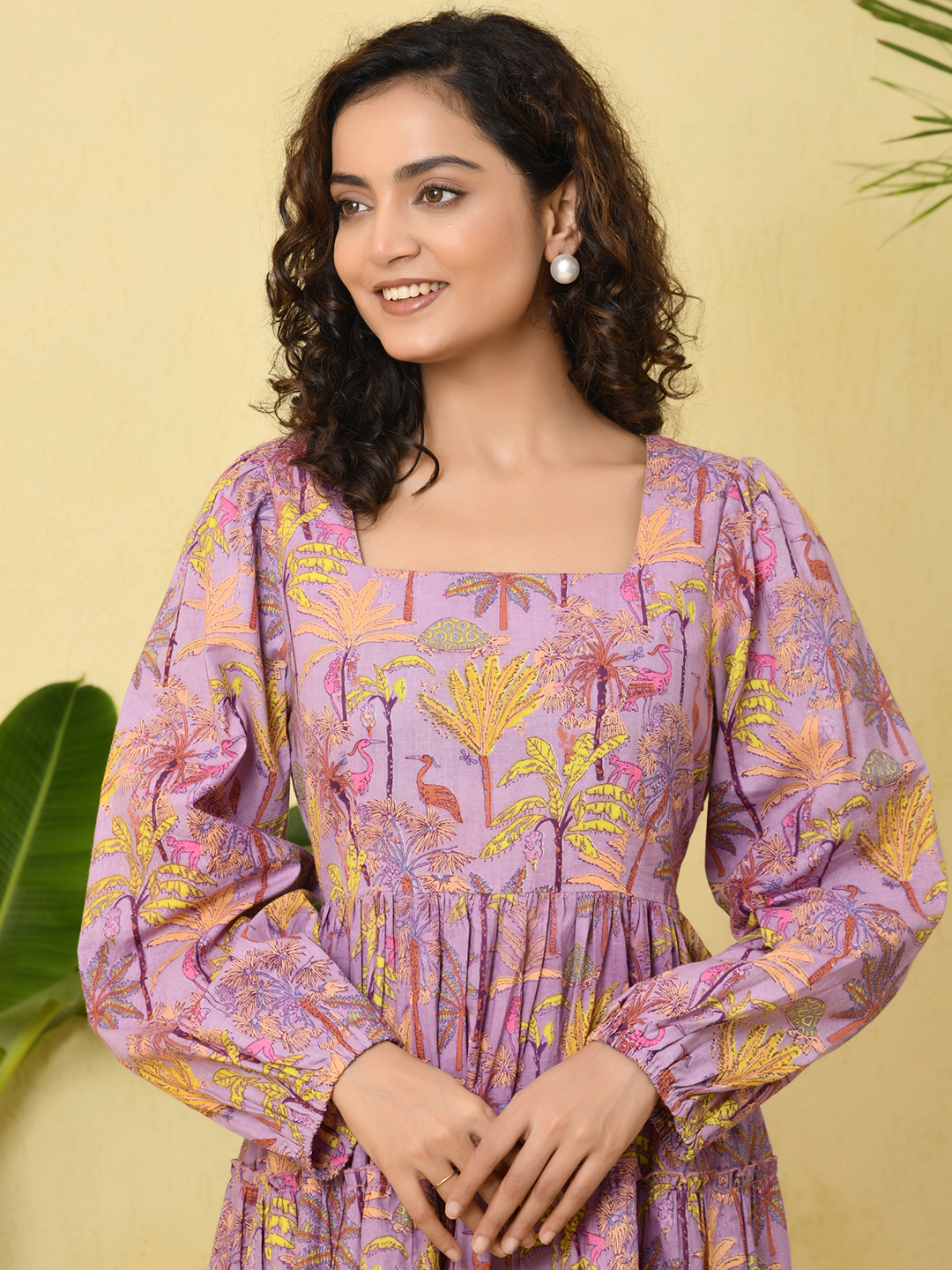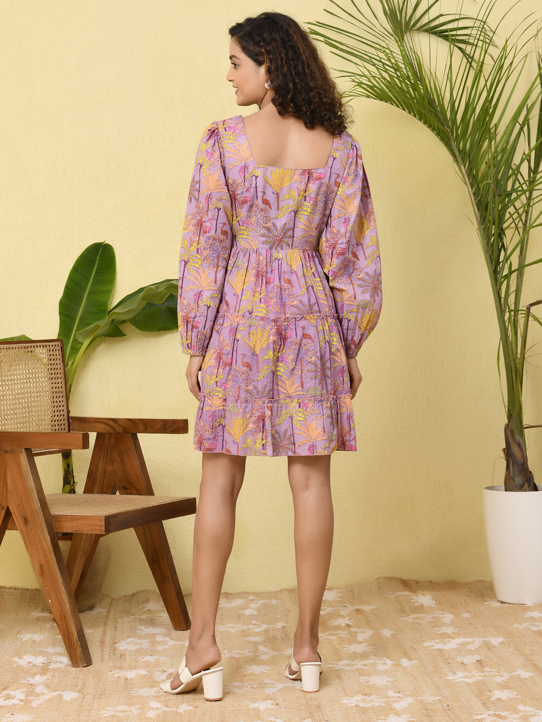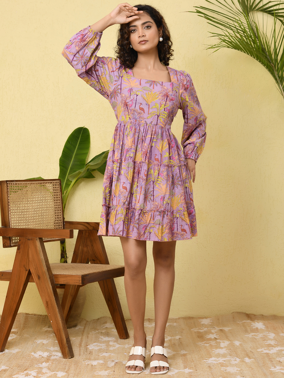 This vibrant tiered dress features a refreshing aqua base highlighted with lively floral prints in shades of purple, pink, and yellow. Designed with a graceful square neckline and full long sleeves, it offers a balanced blend of elegance and comfort. The tiered silhouette adds natural volume and a soft, flowing movement to the dress, creating a flattering and playful look. Crafted in lightweight, breathable fabric, this dress is perfect for daytime outings, vacations, and effortless summer styling.