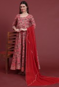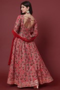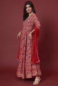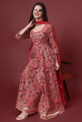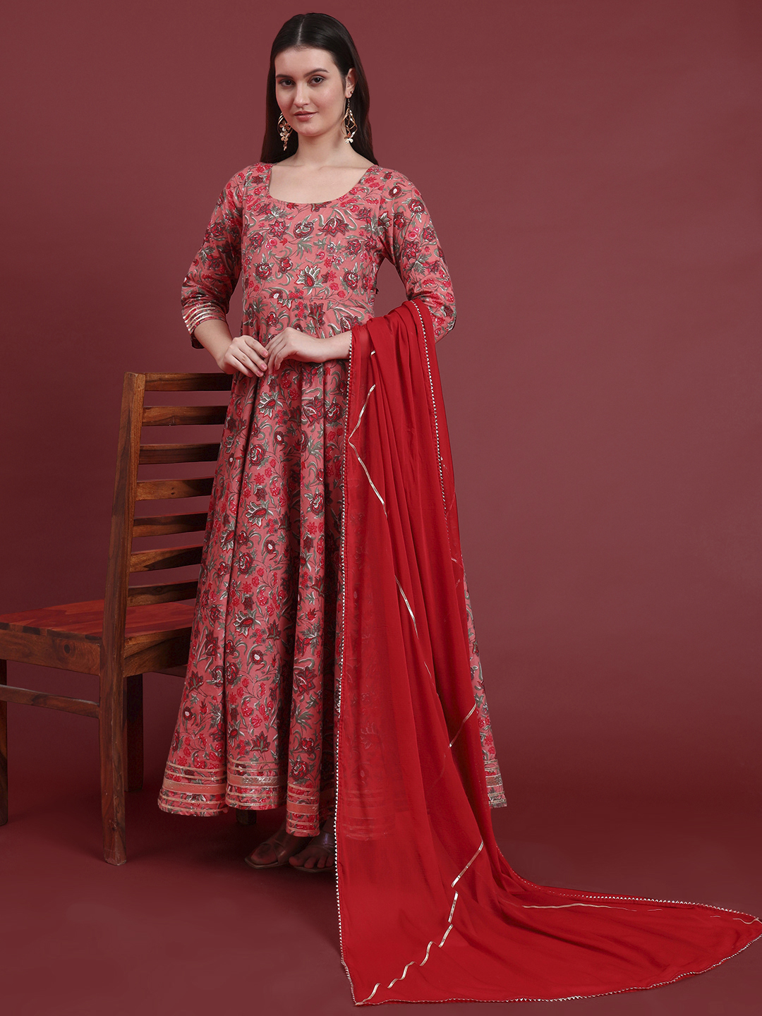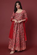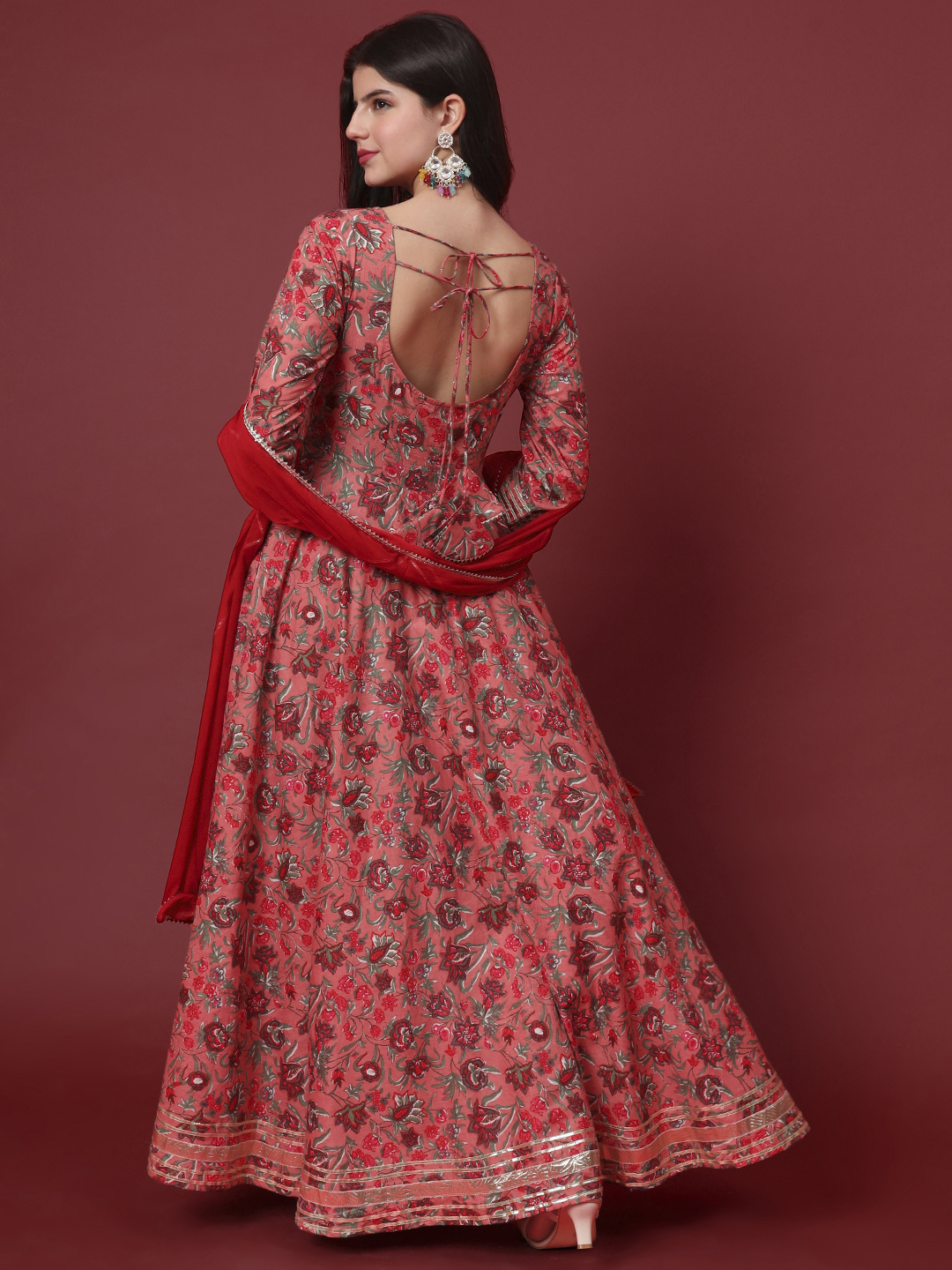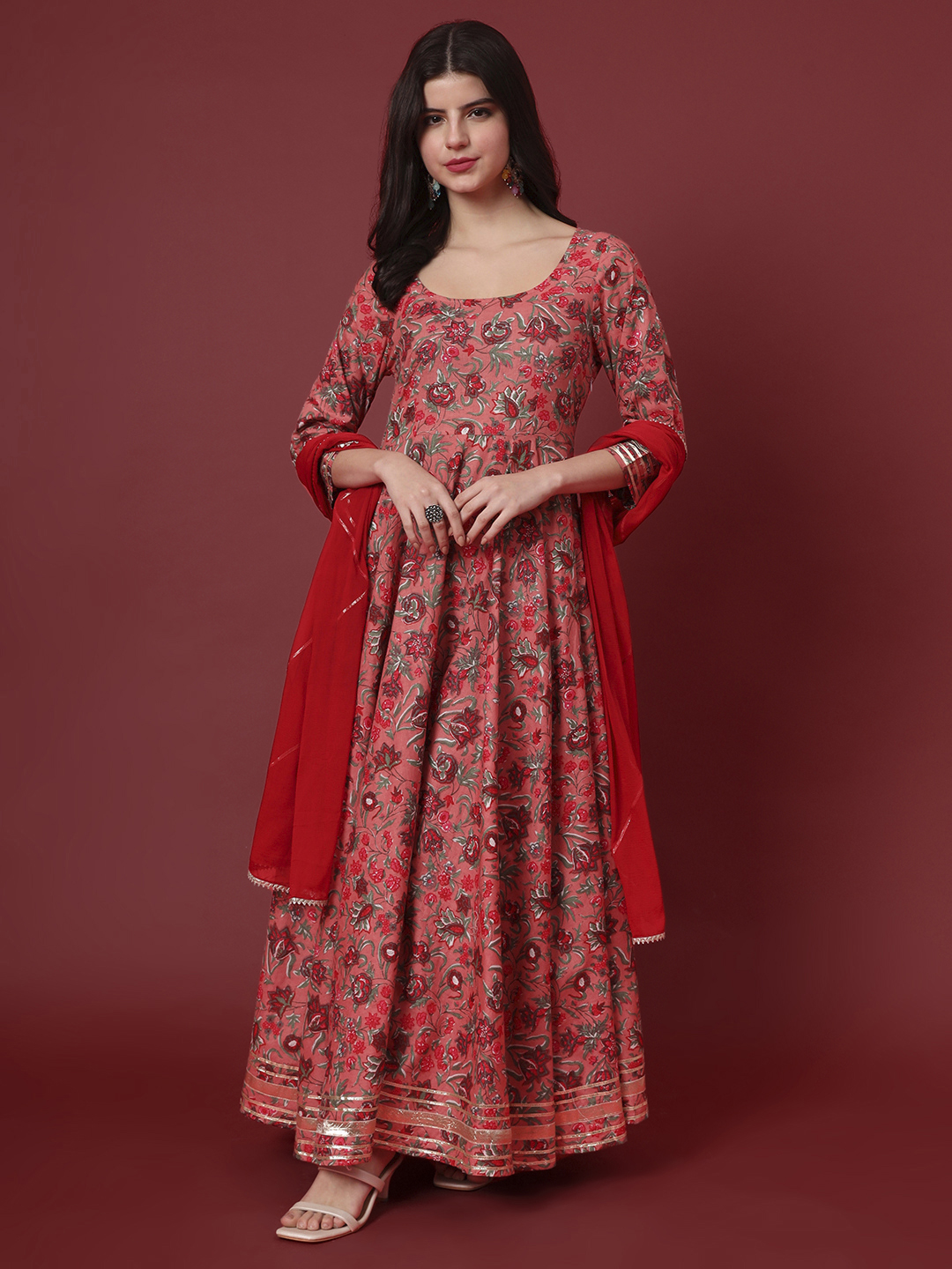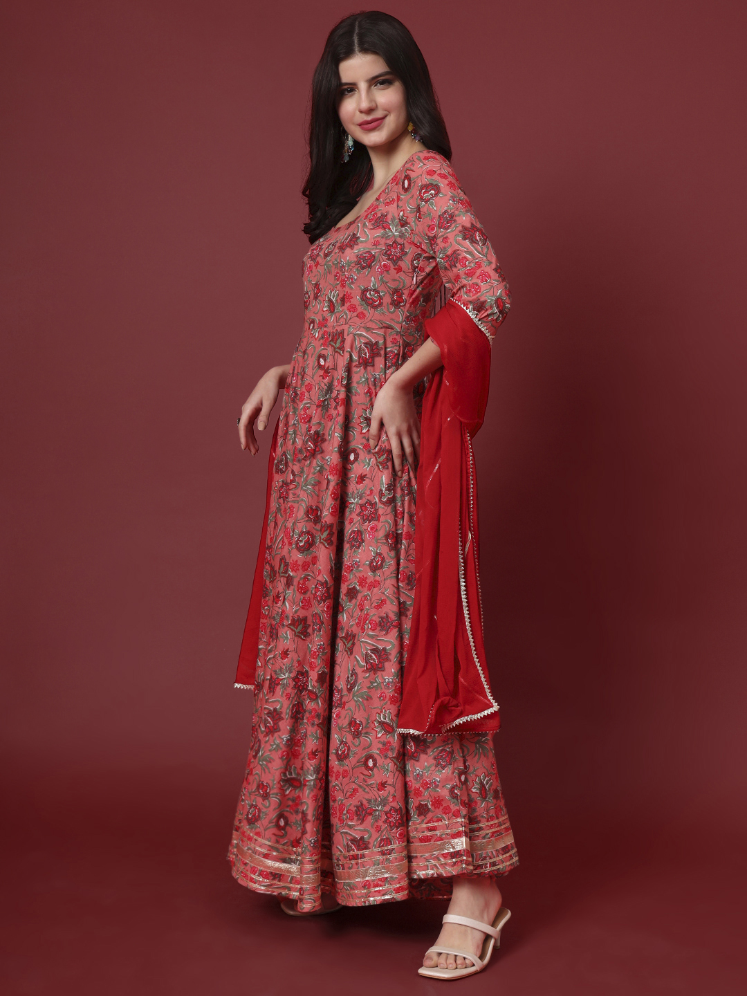 Step into luxury with this magnificent full-length Anarkali set. The flowing silhouette is adorned with an exquisite all-over print, offering a rich tapestry of color and design.