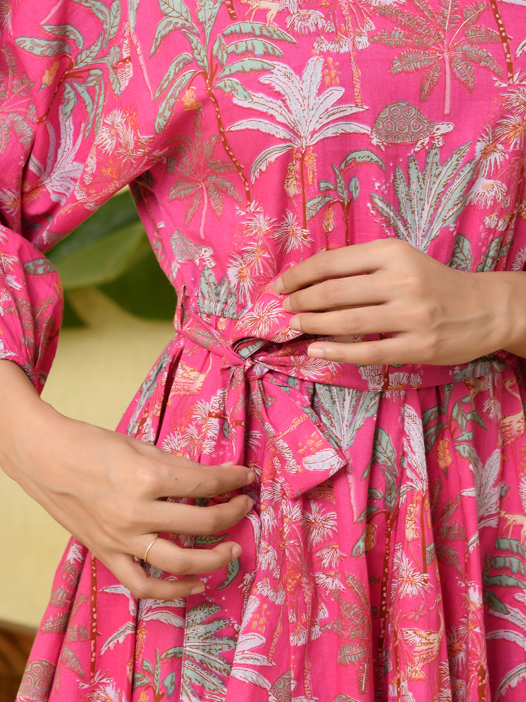 This stunning dress features a vibrant aqua base adorned with an artistic wildlife-inspired print in rich shades of purple, yellow, and green. Designed with full sleeves and soft elastic cuffs, it offers a comfortable and elegant silhouette. The smocked waist enhances the fit while the adjustable self-tie belt adds definition and a touch of charm. Its flared mini length creates graceful movement, making it perfect for daytime outings, weekend brunches, or vacation styling. Lightweight, breathable, and beautifully detailed, this dress blends comfort with captivating tropical flair.